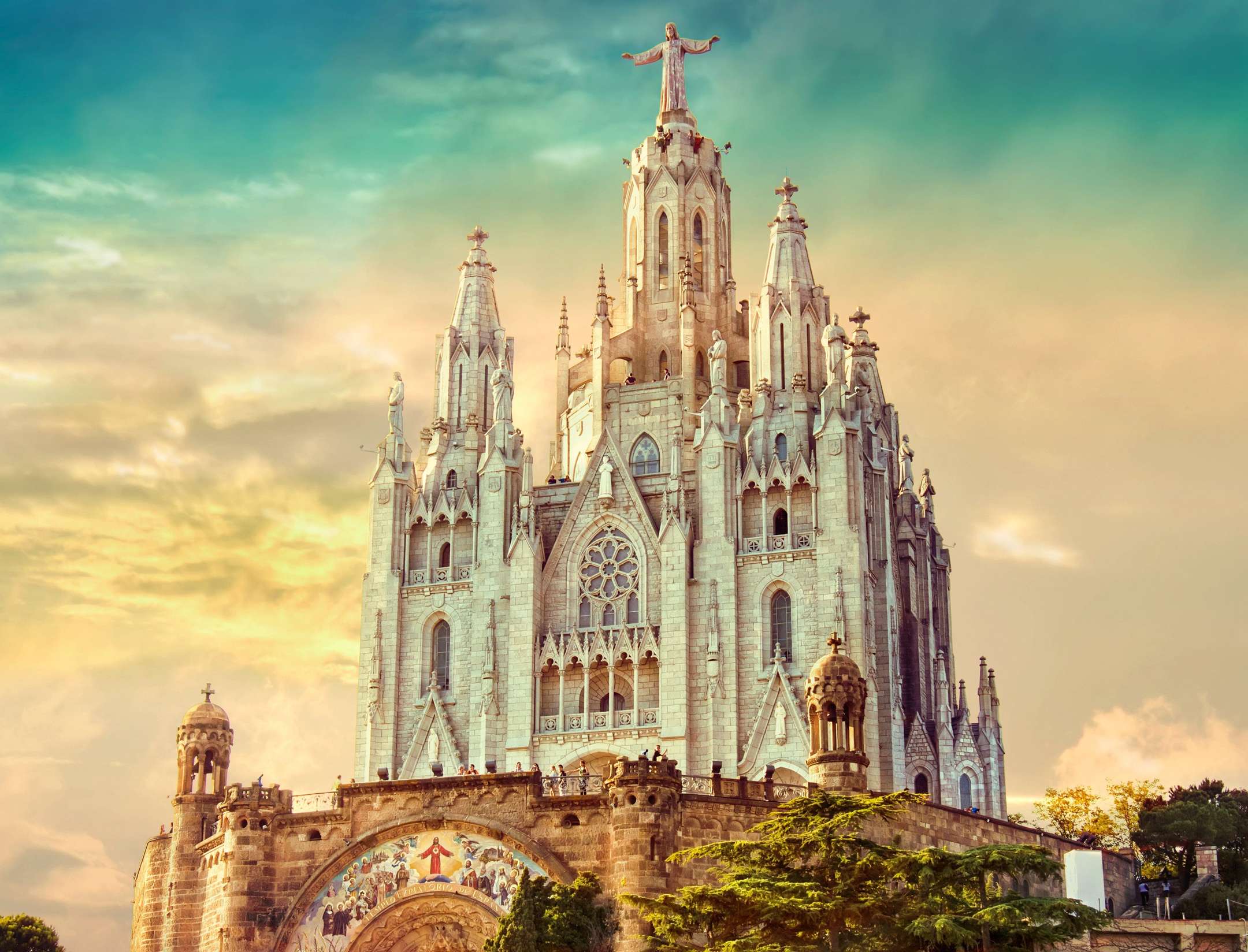 Between 1887 and 1890, architect José Oriol Mestres created the front of the Barcelona Cathedral, which was constructed in the neo-Gothic style. The main door with a huge Gothic arch and archivolts in the center is the piece that stands out the most. Eight stained glass windows and two side towers with tall pinnacles are also displayed on the exterior.